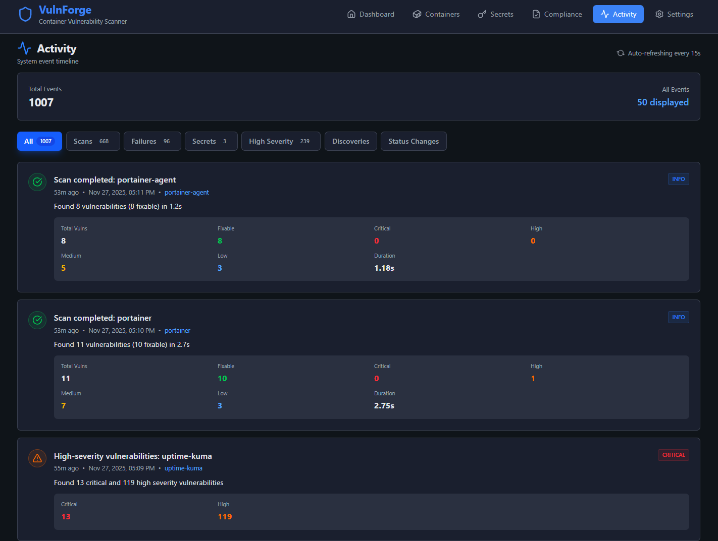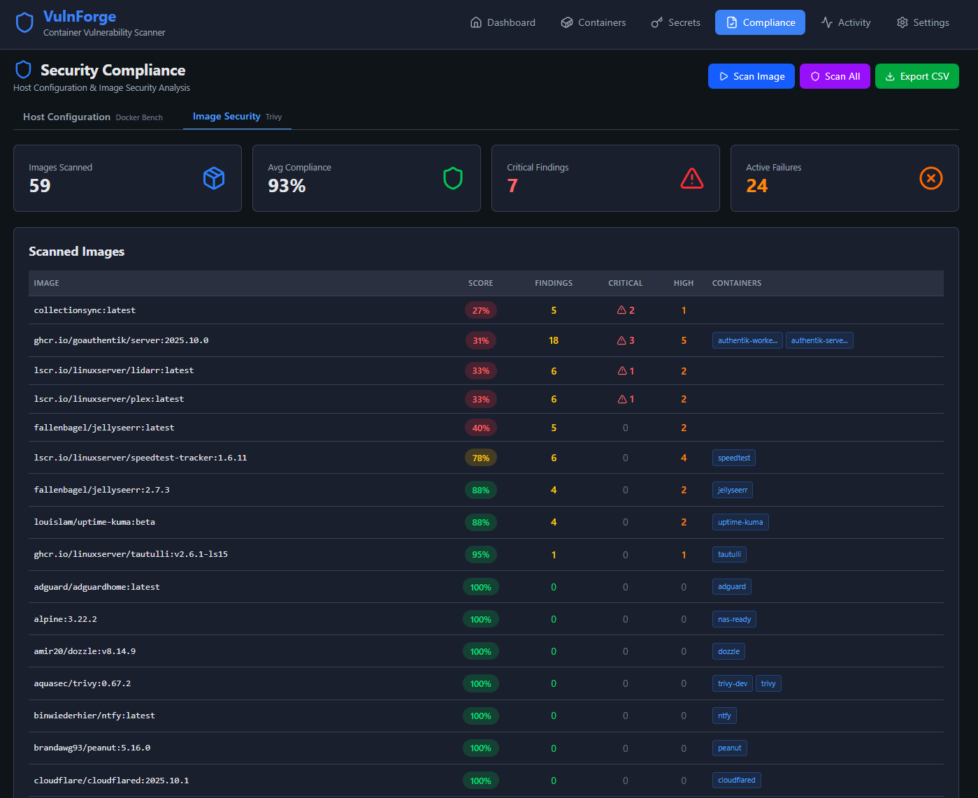 VulnForge is a self-hosted dashboard that keeps homelab operators on top of container security. It combines Trivy, Docker Bench, Dockle, and Dive to surface vulnerabilities, configuration drift, and image hygiene issues in one placeβall without relying on external SaaS services.