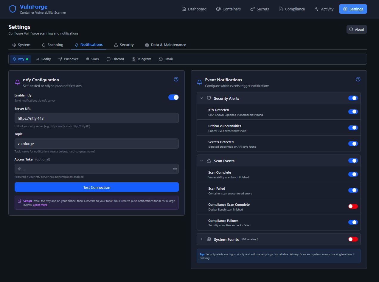 - β’ **Notification Architecture** - Migrated from single NtfyService to NotificationDispatcher β All notification call sites updated to use dispatcher β Existing ntfy settings preserved (backward compatible) β Event types mapped to priority levels and tags