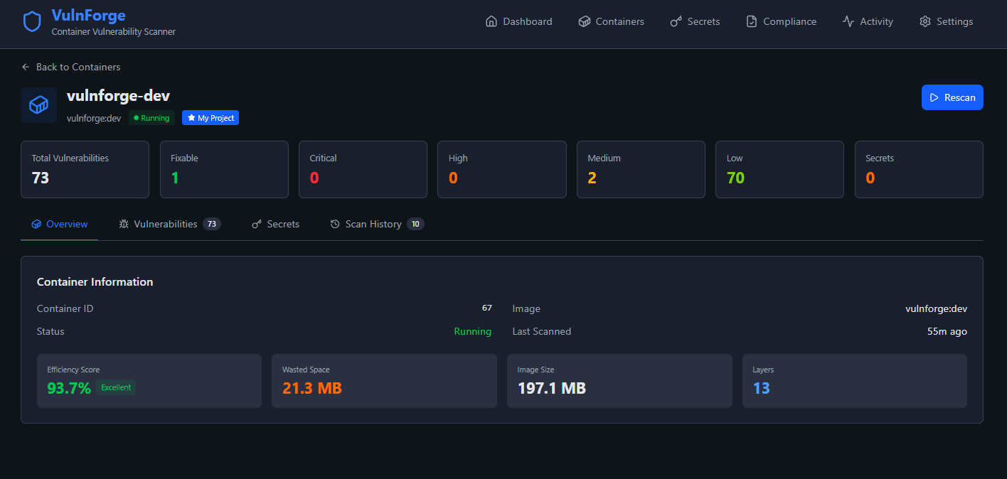 VulnForge is a self-hosted dashboard that keeps homelab operators on top of container security. It combines Trivy, Docker Bench, Dockle, and Dive to surface vulnerabilities, configuration drift, and image hygiene issues in one placeβall without relying on external SaaS services.